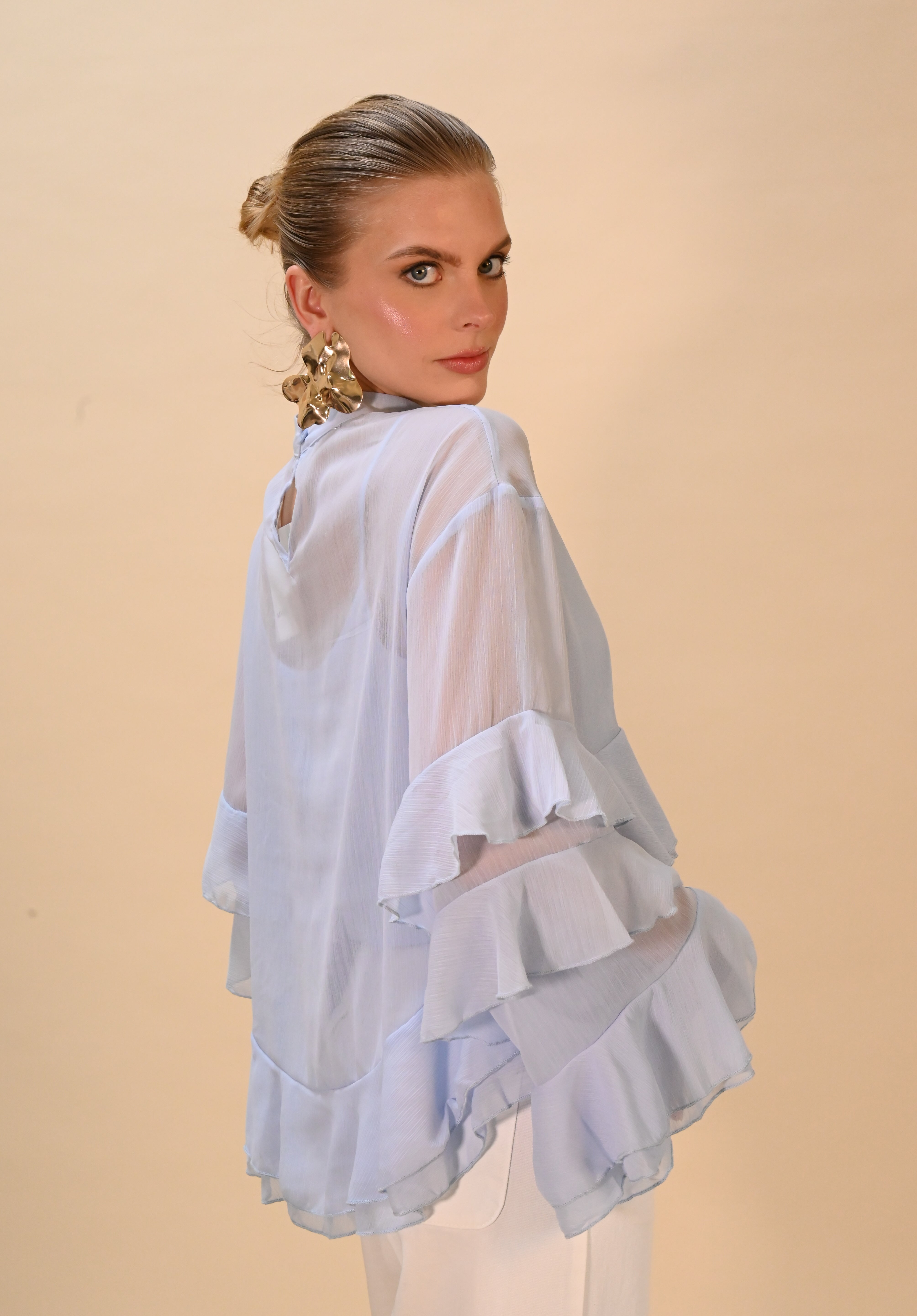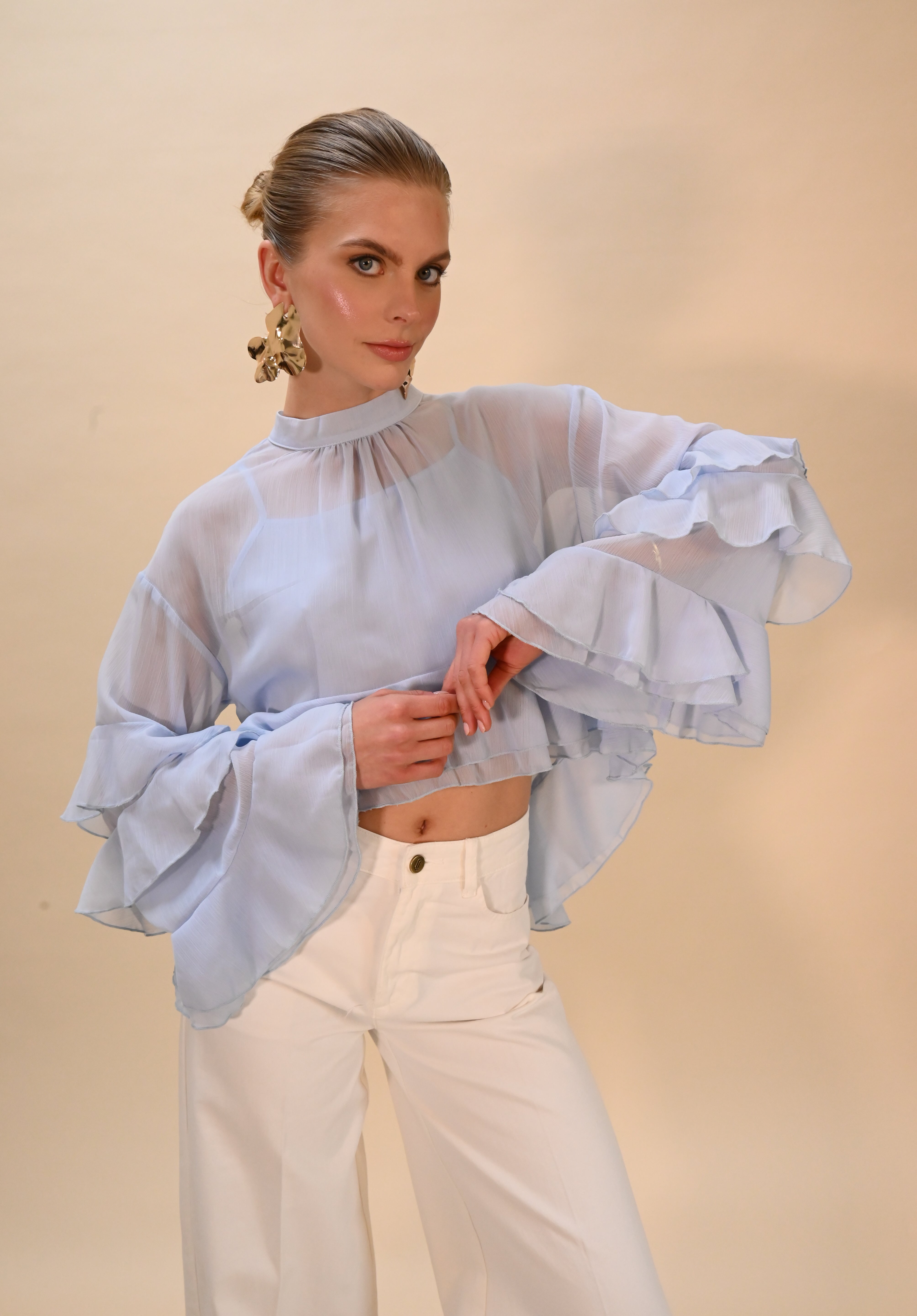 Licht blauwe blouse met ruches en lange mouw