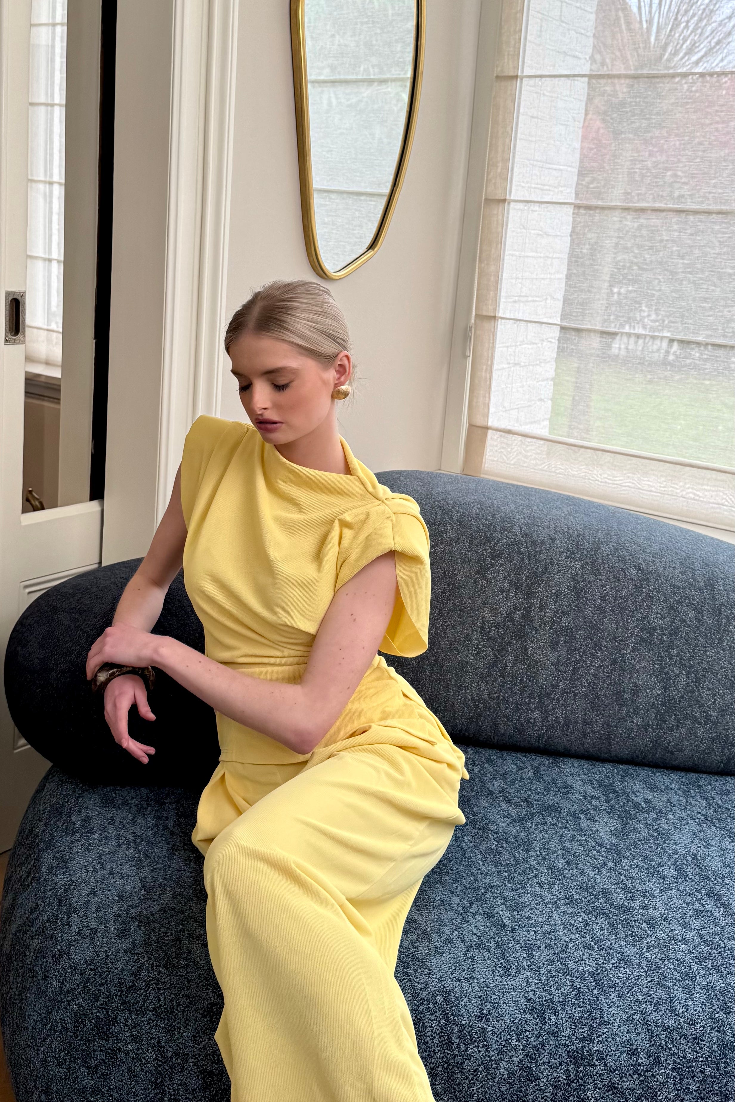 Licht gele trendy T-shirt met subtiele schoudervorm