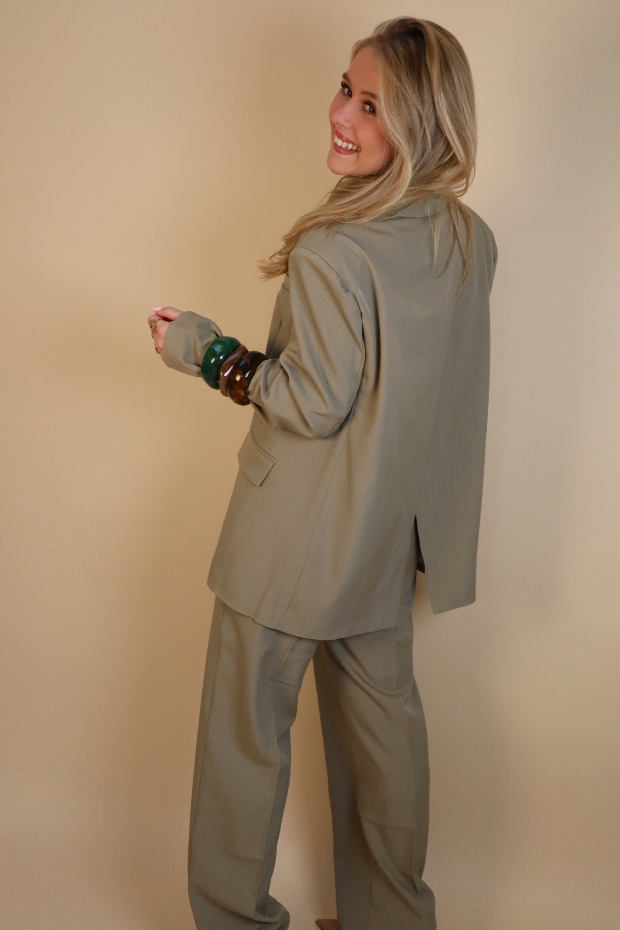 Prachtige blazer met mat groene kleur, te combineren met onze broek. Kan gedragen worden in alle seizoenen.