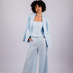 Deze stijlvolle 3-delige set combineert moeiteloos vrouwelijkheid, kracht en comfort. De kleurtinten geven een frisse, luxe uitstraling en maakt de set perfect voor zowel werk als diner of een event. De soepel vallende broek met wijde pijpen creëert een elegant silhouet, terwijl de gestructureerde blazer en vrouwelijke top zorgen voor een verfijnde balans tussen chic en modern.
