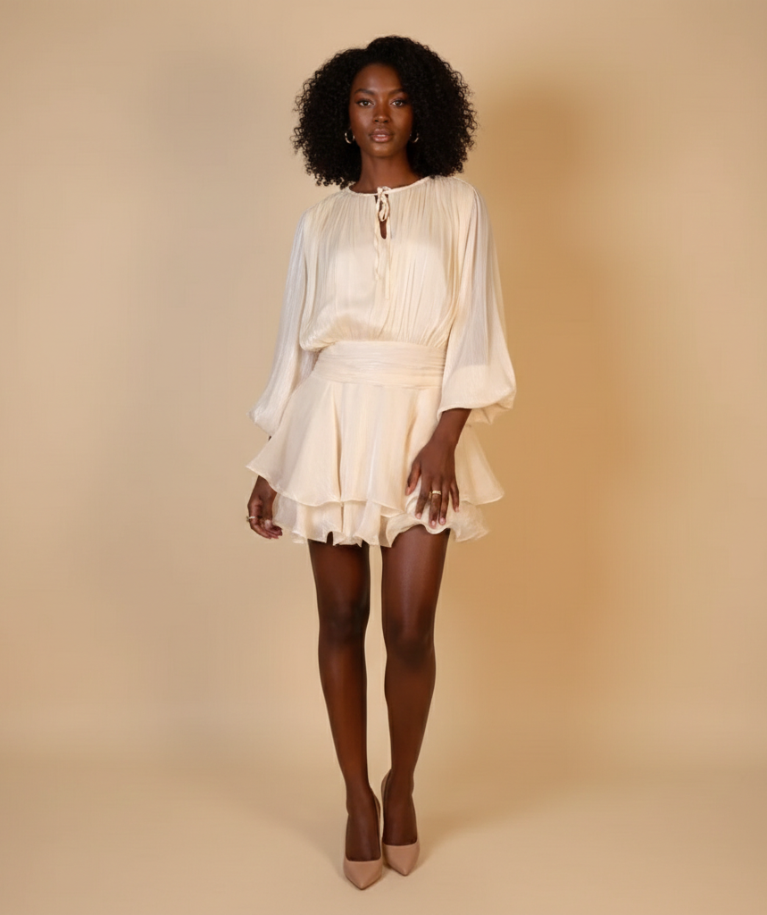 Feestelijke beige, korte jurk, ideaal voor het feest seizoen, met lange mouwen