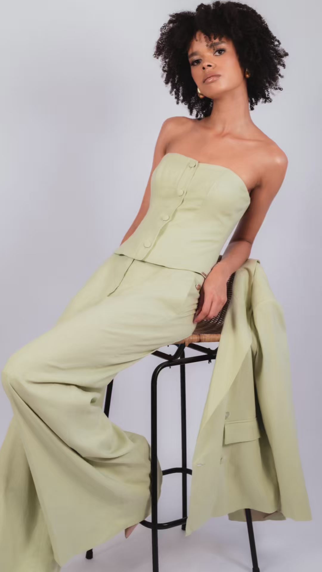 De wijde broekspijpen verlengen het silhouet, terwijl de gestructureerde blazer en vrouwelijke top zorgen voor een moderne en elegante uitstraling. Draag de set samen voor een krachtige look of combineer de items apart.