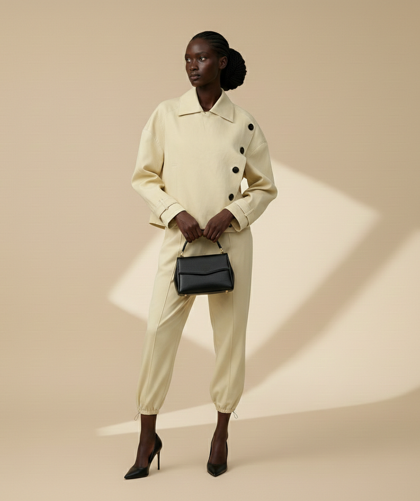 De jas is ontworpen met een asymetrische sluiting met opvallende zwarte knopen, dit contrasteert met de licht gele kleur. De jas heeft een grote, klassieke kraag en de mouwen zijn afgewerkt met een manchetteband wat het een trenchcoat-accent geeft. Twee grote steekzakken maaken het geheel af.