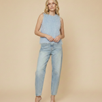 Deze top is een echte eye-catcher. Het model is uitgevoerd in een zachte lichtblauwe tint. De afwerking is met een harige, fluffy structuurstof. De top heeft een ronde halslijn en is mouwloos met een losvallende pasvorm. De top heeft één knoopsontsluiting in de nek.