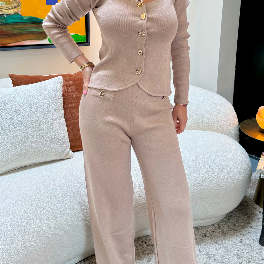 Long-sleeved cardigan with gold buttons. Trousers with fun details.