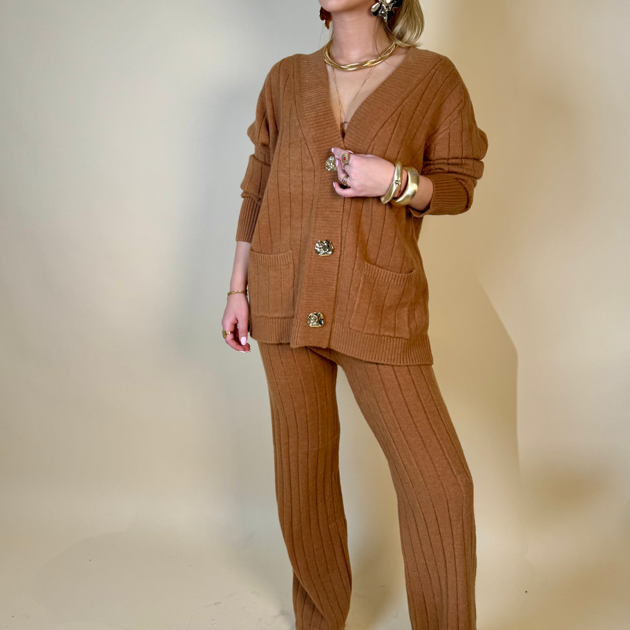 Bruin setje, vest met lange mouwen en zakken. Gouden knopen. Broek met elastiek dus makkelijke pasvorm. Voor alle gelegenheden.